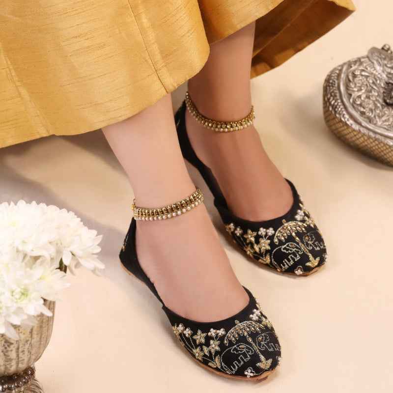 A statement black khussa adorned with regal elephant motifs in gold—made for shaadi season and every festive night. Hand-embroidered with zari, beads and sequins, it sparkles without feeling heavy. A cushioned in-sock and flexible sole keep you comfy from mehndi to walima.
