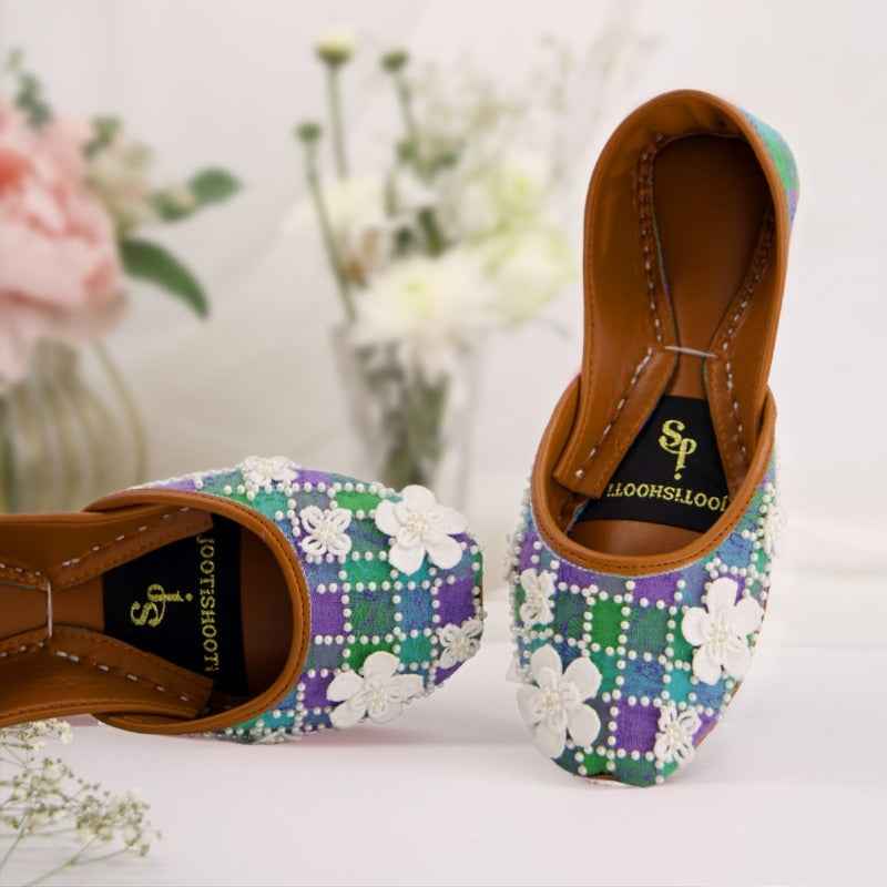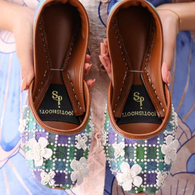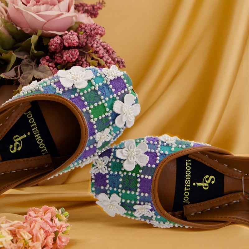 Step into a garden of dreams with daisy khussa. Adorned with delicate white floral embellishments on a refreshing palette of lavender, teal, and green checks, this khussa is a celebration of nature's elegance. Perfectly handcrafted for summer days and festive evenings, this khussa blends traditional craftsmanship with contemporary charm. A must-have pair for those who cherish a bloom-filled, vibrant style.