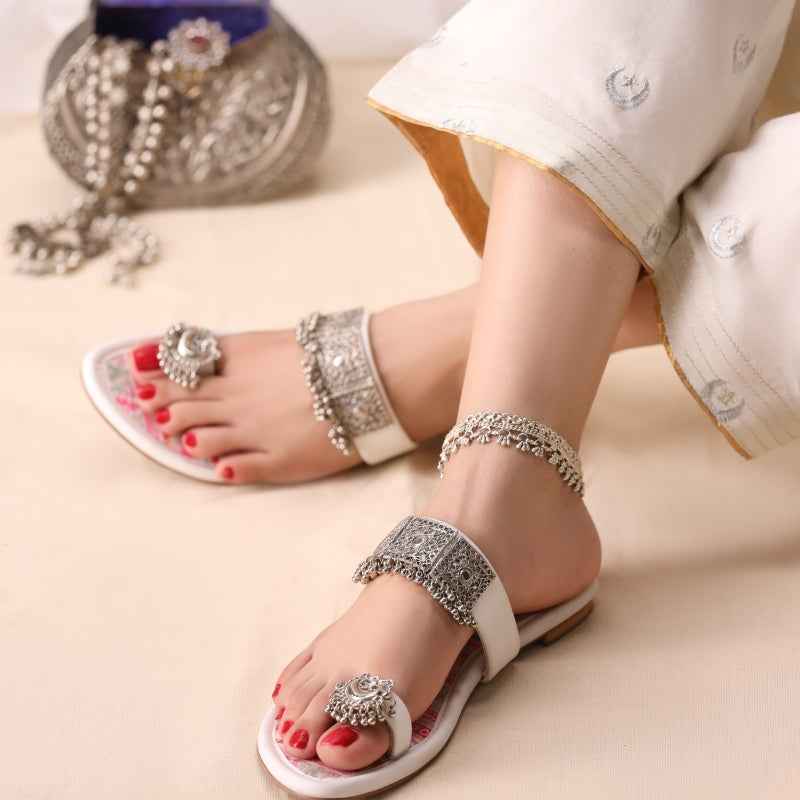 This bright-white faux-leather sandal is detailed with handcrafted silver-tone filigree on the vamp and toe ring, contrasted by a printed-velvet insole in vibrant pink-and-peach geometric stripes inspired by heritage motifs. Because each print and metal ornament is applied by hand, you’ll notice charming micro-variations that make every pair uniquely yours. Style these with pastel organza pants and oxidized-silver jewelry for a light, modern look, or let the geometric insole peek out beneath a monochrome kurta for subtle evening intrigue. To preserve their crisp appearance, gently blot the leather straps with a damp cloth, dust the filigree details with a soft, dry cloth, and store in a dust bag in a cool, dry place.