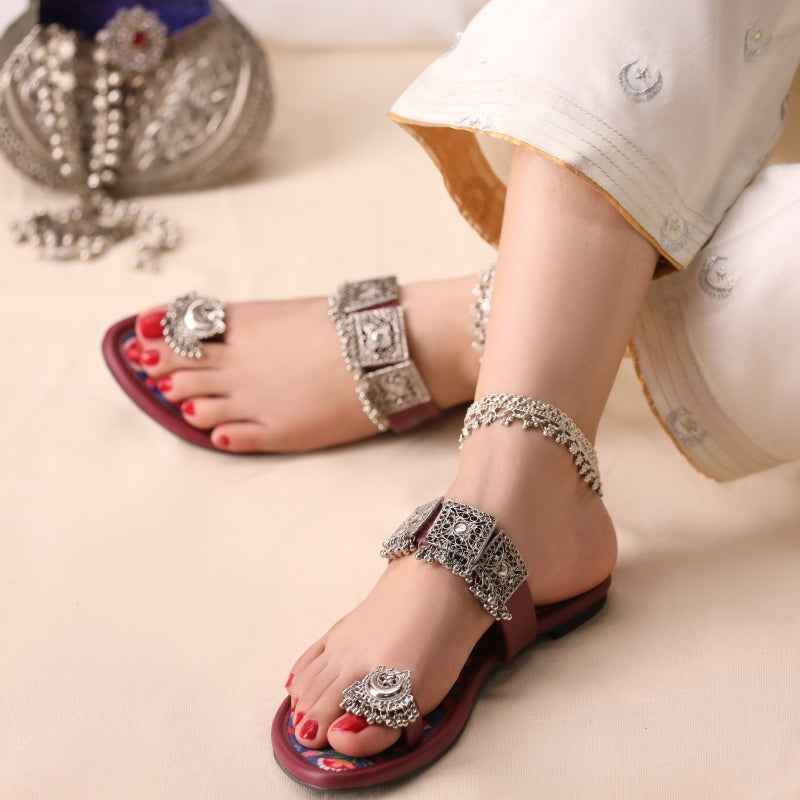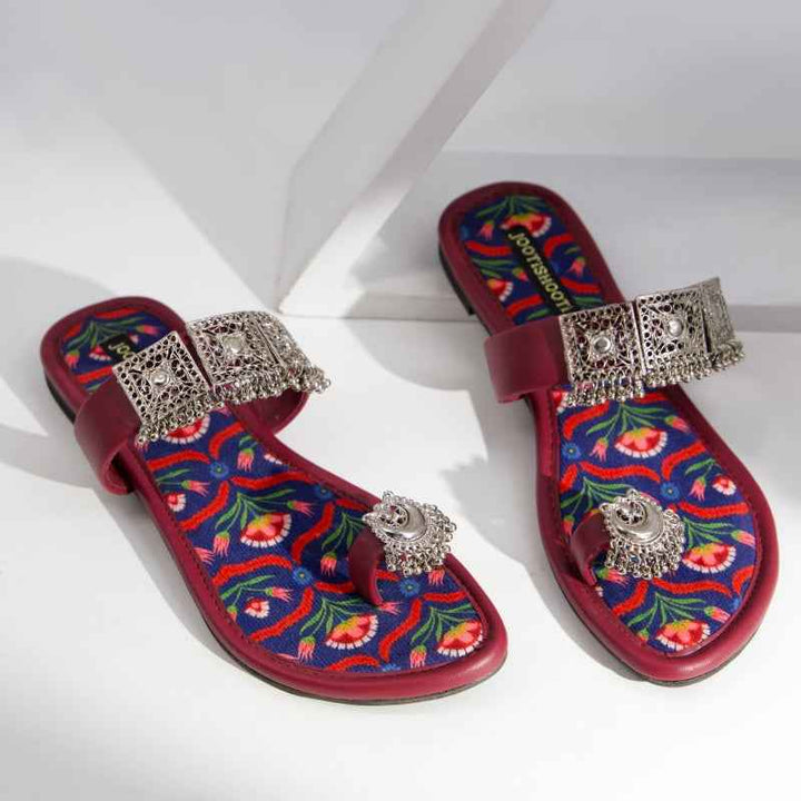 This maroon faux-leather sandal is crowned by hand-finished silver-tone filigree panels across the vamp and a coordinating jhumka-style toe ring, all set atop a printed-velvet insole showcasing crimson and emerald floral motifs on a deep cobalt background. Because each piece of metalwork and velvet print is applied by hand, no two pairs are exactly alike. Style yours with ivory linen trousers and oxidized-silver bangles for a fresh daytime look, or let the jewel-toned florals pop against a charcoal kurta for evening elegance. To keep them looking their best, gently wipe the faux-leather with a damp cloth, dust the metalwork with a soft, dry cloth, and store in a cool, dry place away from direct sunlight.