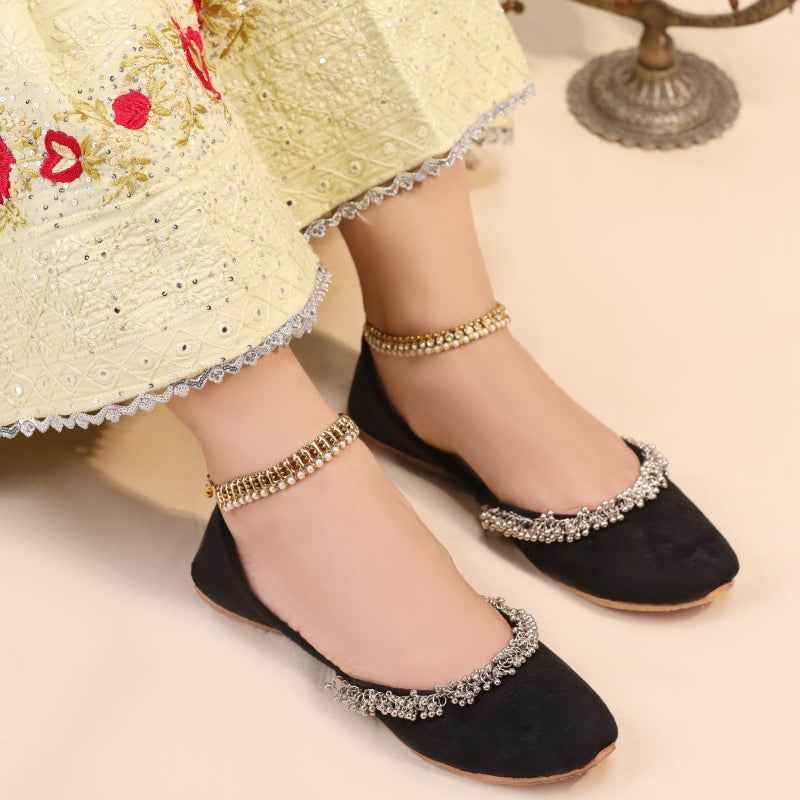 A refined party edit with a sparkling halo of hand strung round beads tracing the neckline. The upper has a soft velvet touch and the silhouette stays clean and elegant. A cushioned insole and flexible sole keep you comfortable from tea to mehndi.