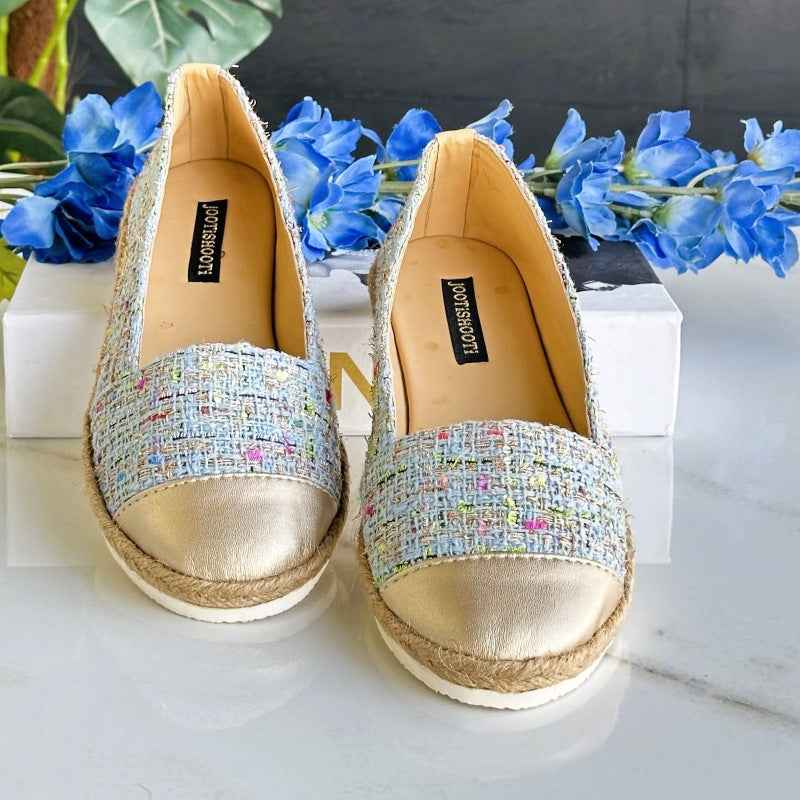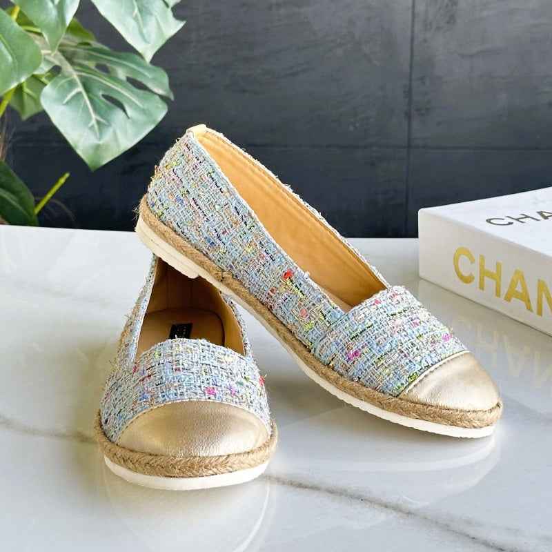 Elevate your casual look with our espadrille-inspired tweed loafers. A celebration of color and culture, these flats fuse multicolor tweed with a radiant matt gold toe—like sunlight kissing a woven meadow. The jute sole adds earthy elegance, while the metallic accent whispers luxury. Ideal for those who blend tradition with trend.