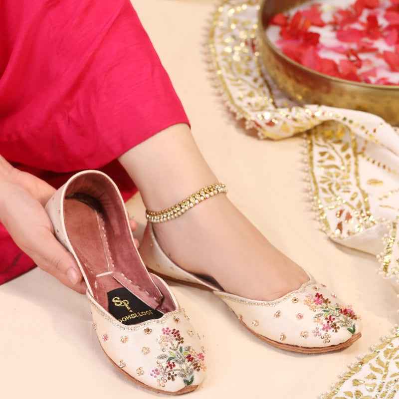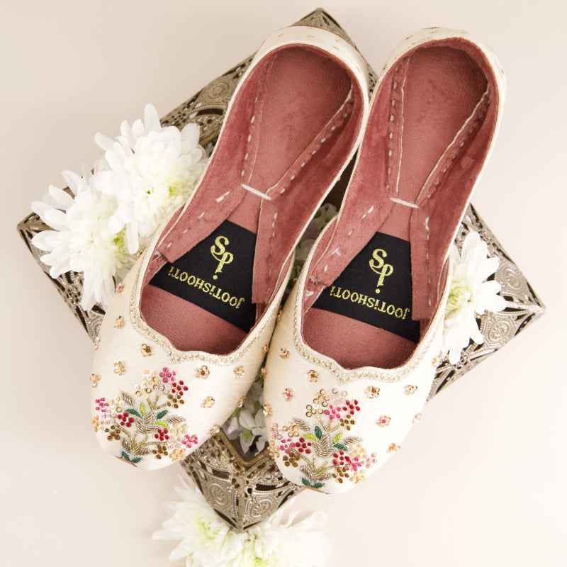 A White khussa with a vivid lining and handwork that blooms in ombre. Ombre Oasis features clustered florals in jewel tones with gold sequins and cut dana that graduate in depth for a rich, dimensional look. Master artisans finish each pair by hand. A cushioned insole and flexible sole keep you comfortable from ceremony to after party.